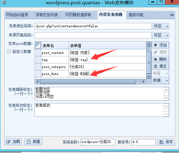 这里面有发布参数,参数前面的表单名对应的是数据库里面的项目,后面的表单值是我们自己写的。